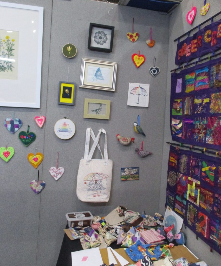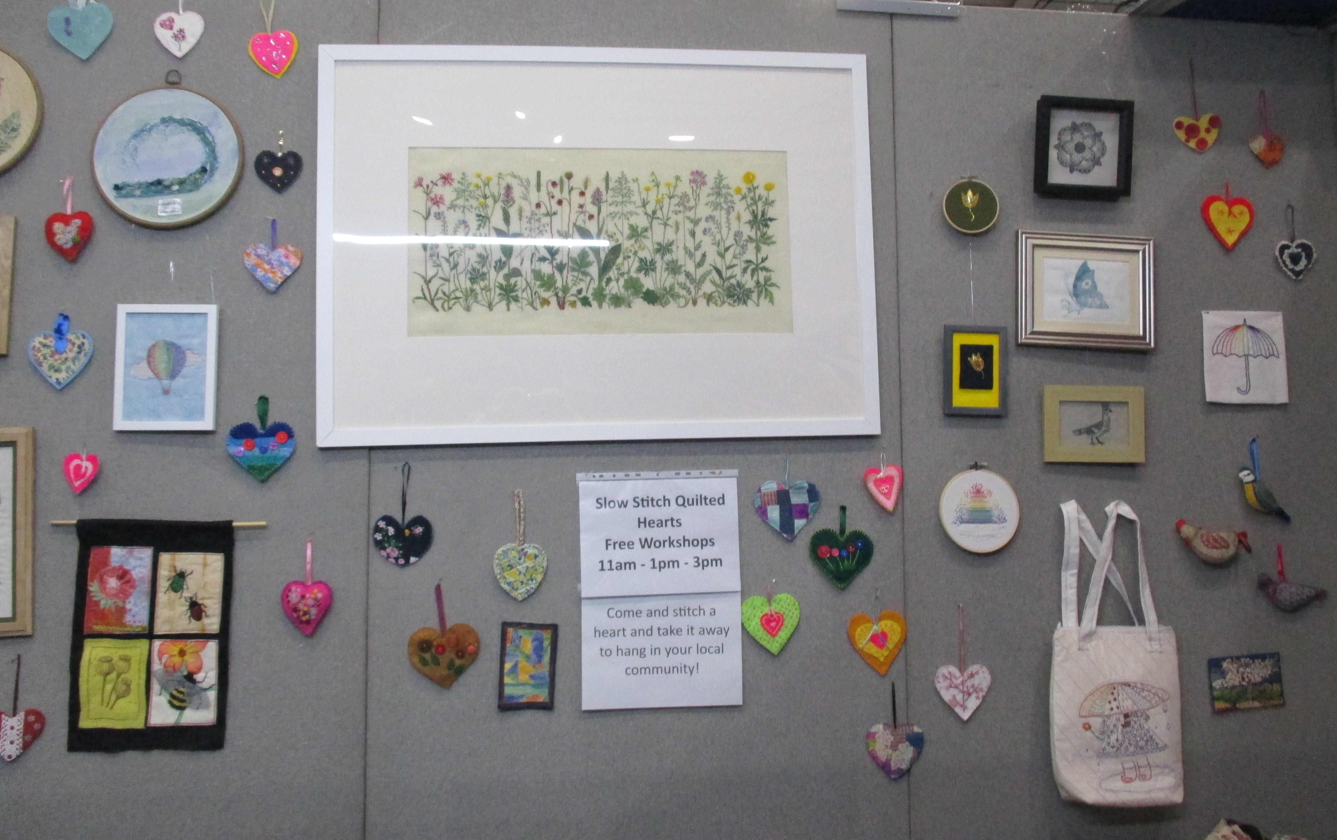 We’ll never forget the Spring, Craft4Crafters shows we exhibited at, where her experience of organising our stand was always welcome. Her husband going up the ladder to put in nails on top of the boards under her instruction as she always had a vision of how best to display our work. Her ability to show us inventive ideas from stitching to printing and dyeing fabric for us to create unique pieces of stitch at the workshops she ran at our monthly workshops.